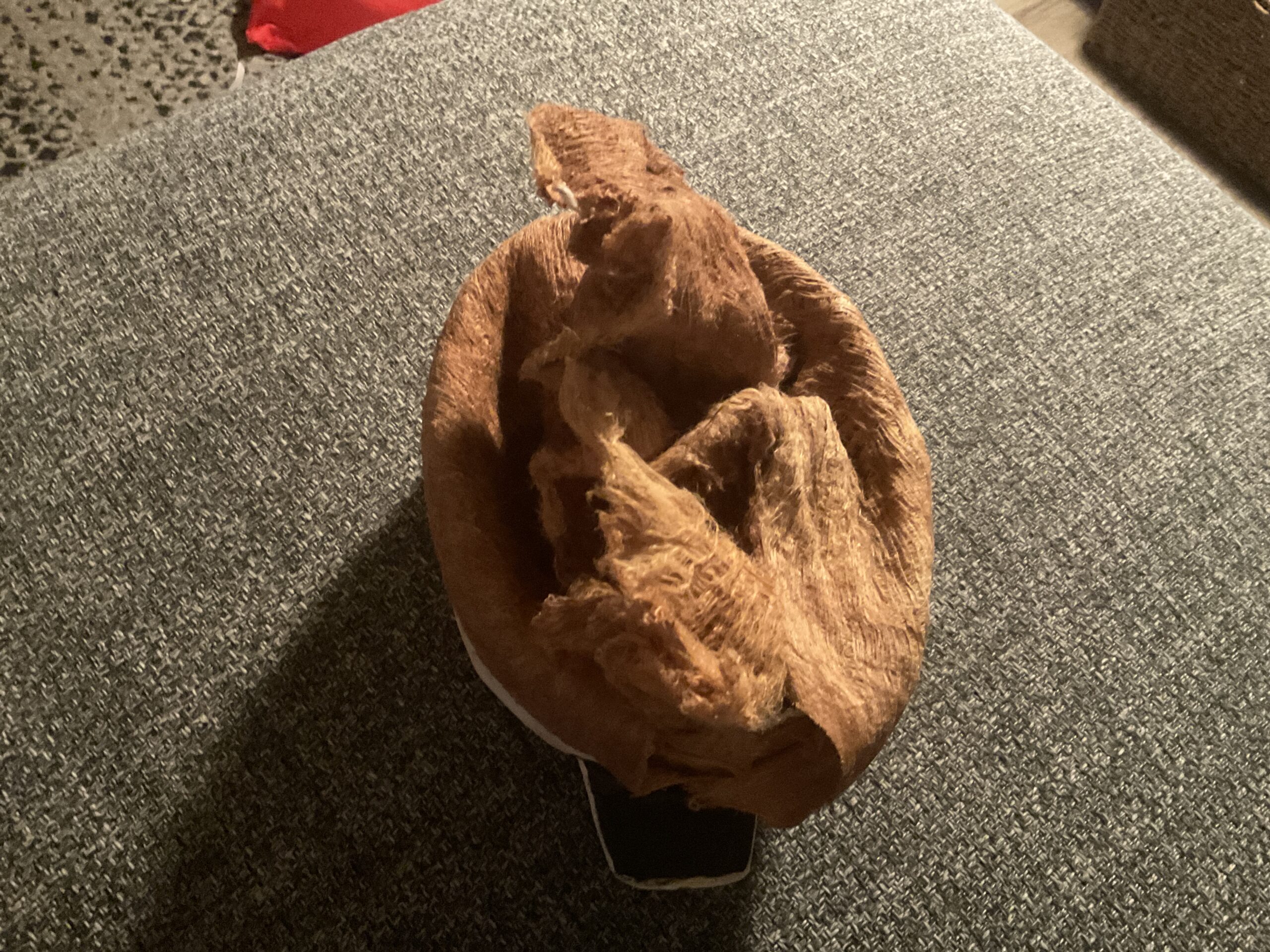 A face modeled in blackened beeswax, a documented technique in several Amazonian ceremonial masks.